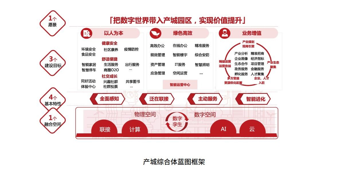建設(shè)目標(biāo),基于以人為本、綠色高效、業(yè)務(wù)增值,可圍繞產(chǎn)城綜合體作進(jìn)一步深化設(shè)計,以人為本體現(xiàn)在健康安全、舒適便捷和社交成長等;綠色高效可根據(jù)產(chǎn)城綜合體的主要業(yè)態(tài),分別從高效辦公、精準(zhǔn)服務(wù)、智慧能效空間運(yùn)營等場景展開設(shè)計;業(yè)務(wù)增值可從產(chǎn)業(yè)規(guī)劃、生態(tài)發(fā)展、資源優(yōu)化配置以及精益運(yùn)營等領(lǐng)域規(guī)劃,實(shí)現(xiàn)與產(chǎn)城綜合體相匹配的智慧化服務(wù)體系和平臺支撐體系。融合空間與全面感知、泛在聯(lián)接、主動服務(wù)和智能進(jìn)化等基本特征,作為支撐產(chǎn)城綜合體的基礎(chǔ),可結(jié)合產(chǎn)城綜合體承載的人機(jī)物事的具體需求進(jìn)行詳細(xì)規(guī)劃。這樣我們就可以定制出指導(dǎo)產(chǎn)城綜合體園區(qū)智慧化規(guī)劃的完整的"1-3-4-1"藍(lán)圖框架(如圖所示)。